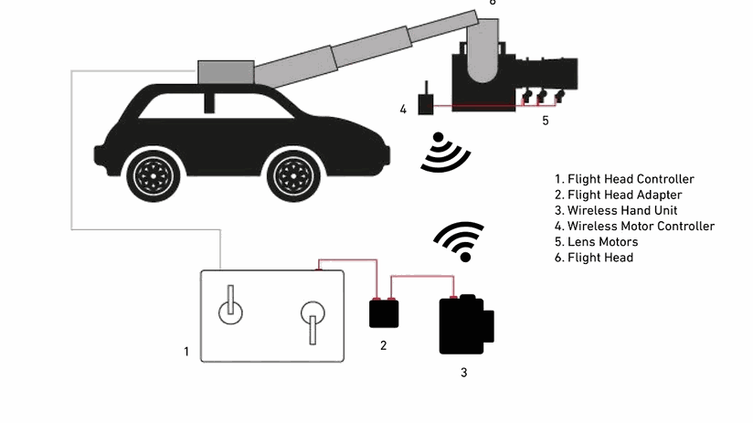 The Flight Head Adapter connects either the  cvolution hand unit, compact LCS hand unit  or ARRI`s WCU-4  to the  Flight Head control panel  via the  FHC-1 cable . The analog zoom signal of the Flight Head control panel is converted into a digital signal and sent to the hand unit. The hand unit sends all signals together (focus and iris of the hand unit and the zoom signal of the Flight Head control panel) to the receiving unit (either cvolution camin, compact LCS camin, ALEXA Plus, ALEXA Mini or UMC-4). In this configuration, the Flight Head operator can control the zoom motor, while the 1.AC has control over iris and focus.